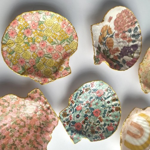 On recouvre une coquille St Jacques avec du papier Décopatch (ou des serviettes en fonction de l’âge) pour en faire un joli vide-poche.