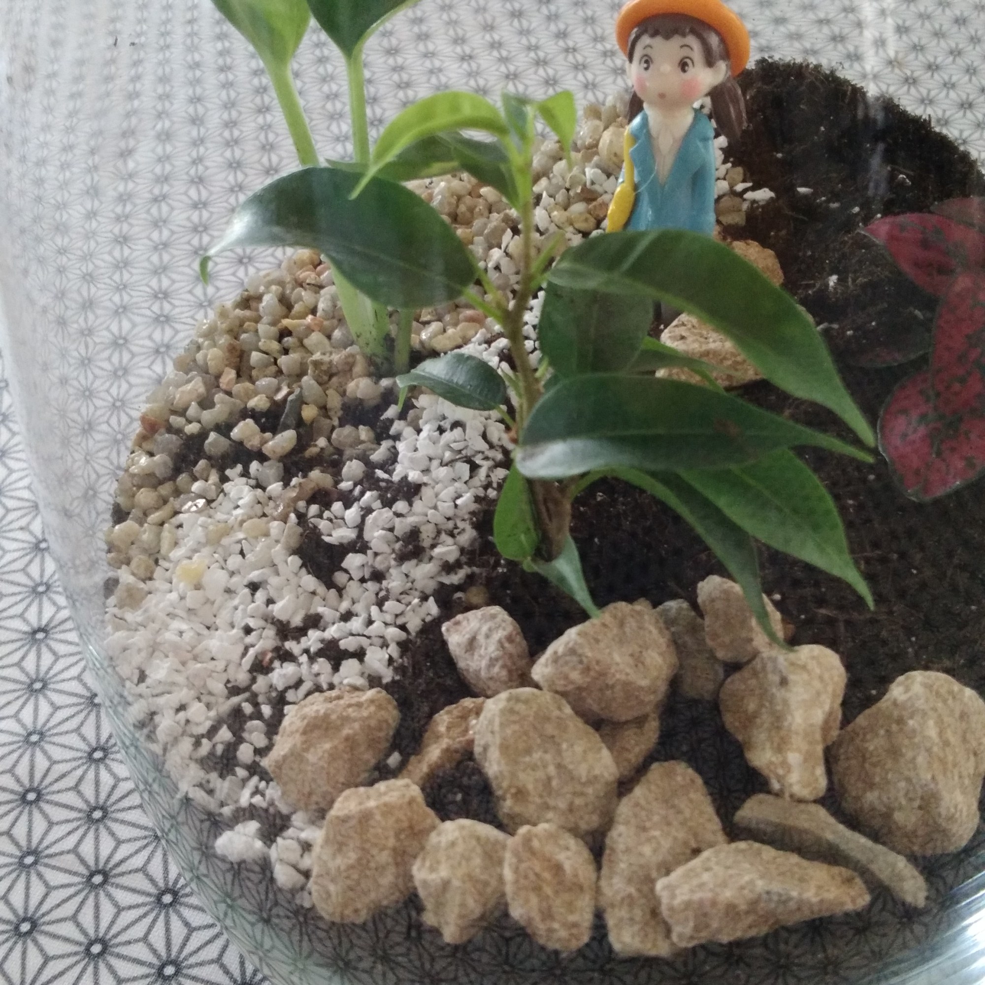 Pot en verre hauteur 20 cm, 3 mini-plantes, terreau, drainage, cailloux et une figurine.