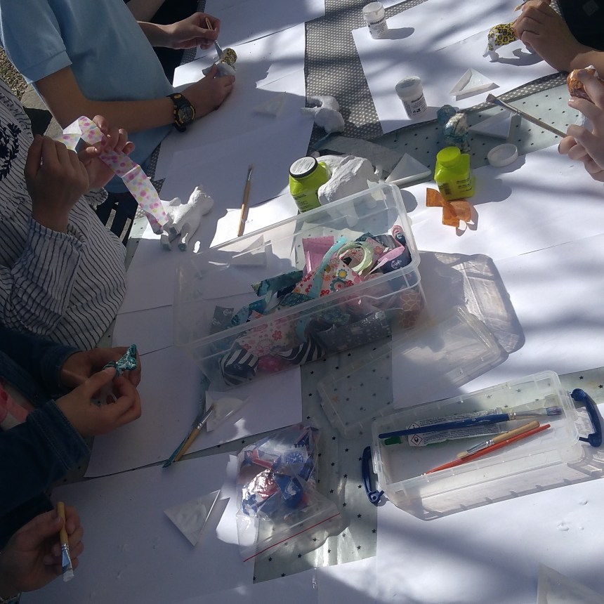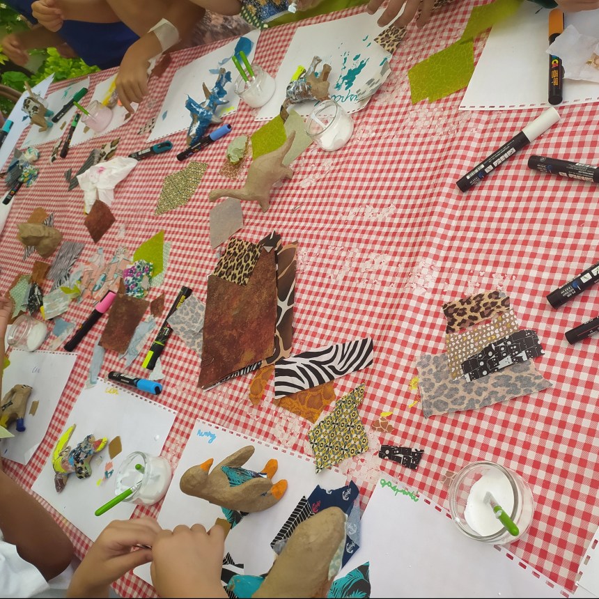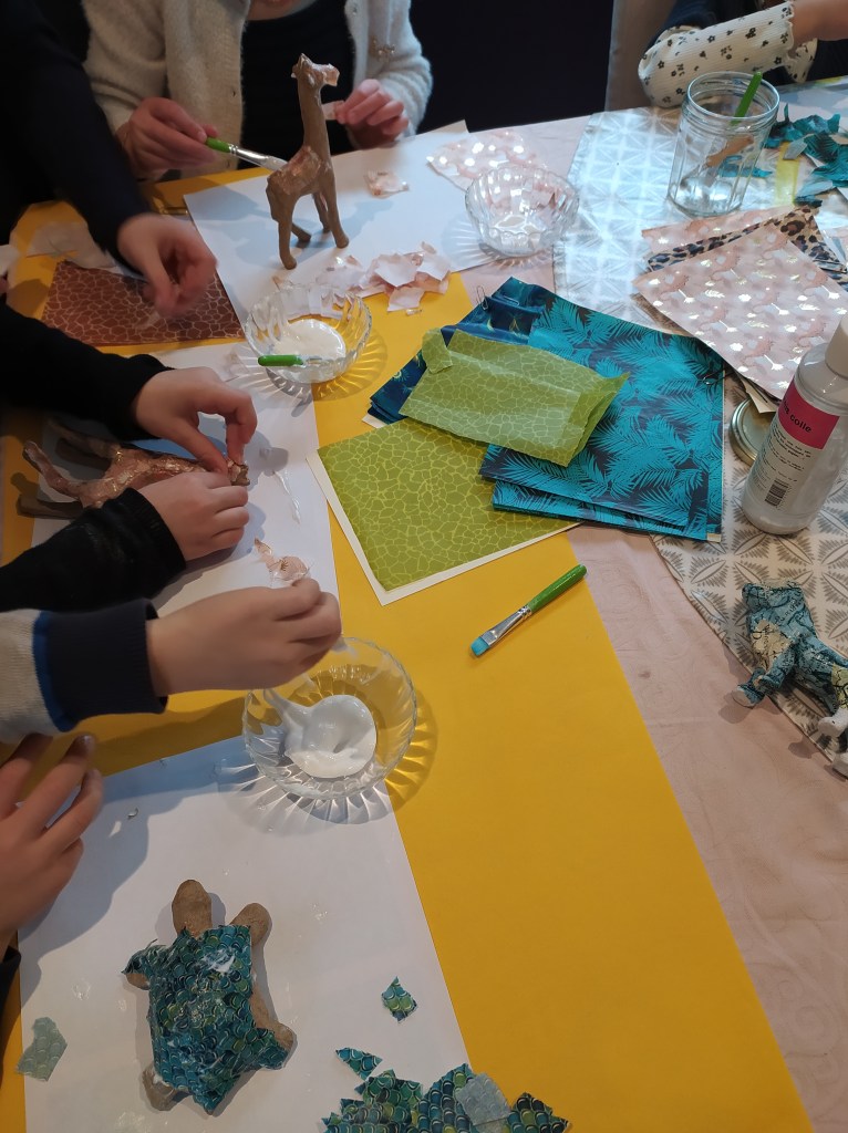 Je propose de décorer un animal avec du papier, la technique se rapproche de la peinture, c’est très amusant. Sélection de jolis papiers assurée !